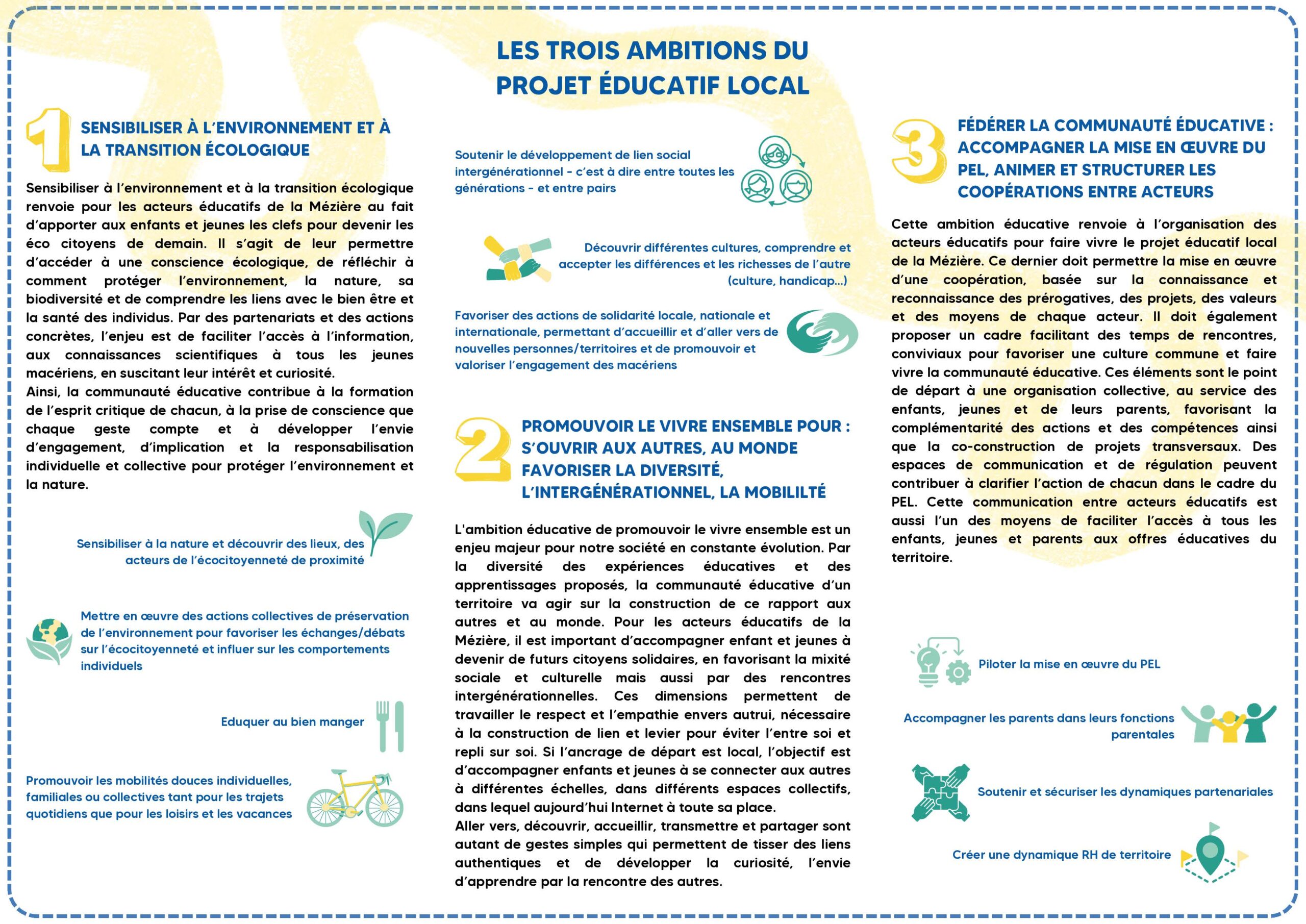 Appuyé sur une volonté politique de concertation, de co-construction, le Projet éducatif local (PEL) permet à l’ensemble des acteurs de La Mézière de partager des ambitions communes pour les enfants et les jeunes, de se mobiliser pour la réussite d’objectifs et d’actions prioritaires, de se coordonner pour intervenir dans le respect des spécificités et des missions de chacun.